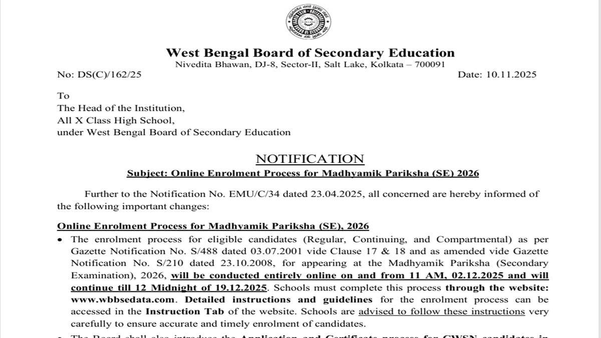 West Bengal Board of Secondary Education (WBBSE) has announced registration process for the Madhyamik Pariksha (Secondary Examination) 2026. All Class 10 high schools under state board have been asked to complete the online enrolment of eligible candidates.