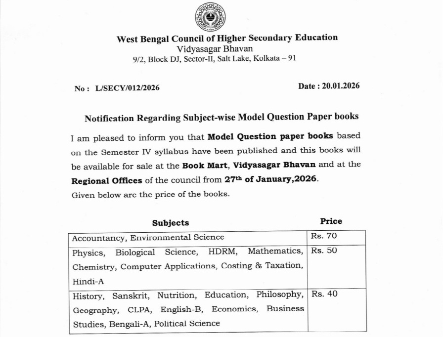 WBCHSE published the Model Question Paper book based on the Semester IV syllabus. These books will be available for sale at the Book Mart, Vldyasagar Bhavau and at the Regional Offices of the council from January 27, 2026. Read below to know the price of the books and more here...