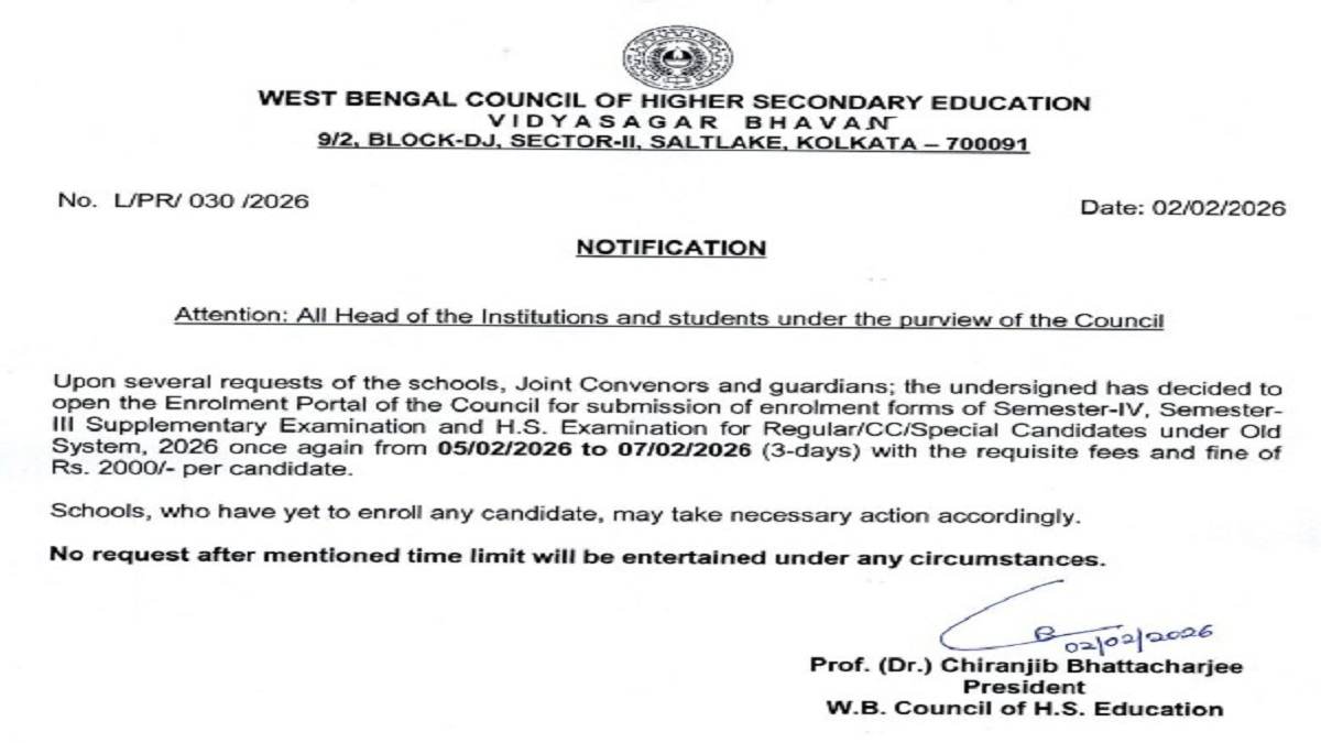 "Upon several requests of the schools, Joint Convenors and guardians, the board has decided to open the Enrolment Portal for submission of enrolment forms of Semester-IV, Semester-III Supplementary Examination and H.S. Examination for Regular/CC/Special Candidates under Old System, from 05/02/2026 to 07/02/2026 " The notification reads.