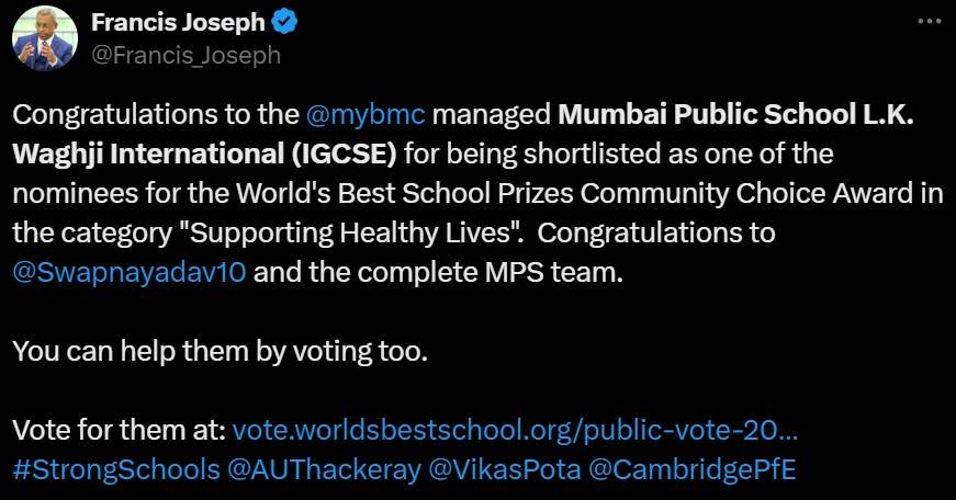 managed Mumbai Public School L.K. Waghji International (IGCSE) for being shortlisted as one of the nominees for the World's Best School Prizes Community Choice Award in the category "Supporting Healthy Lives". Congratulations to