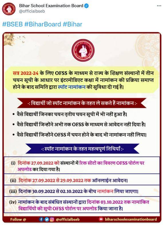 Bihar OFSS Spot Registration 2022: The official schedule for BSEB inter OFSS spot registration for the session 2022-24 has been released by Bihar School Examination Board. Students can register themselves from September 27 to 29, 2022. The Board will release the nomination list on October 3, 2022, through the official OFSS portal, i.e. ofssbihar.in.