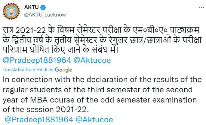 AKTU MBA Results 2022: Dr APJ Abdul Kalam Technical University (AKTU) has announced MBA results for third semester of the second year. Informing the students about the declaration of MBA results 2022, AKTU through its official Twitter handle said, “In connection with the declaration of the results of the regular students of the third semester of the second year of MBA course of the odd semester examination of the session 2021-22.”