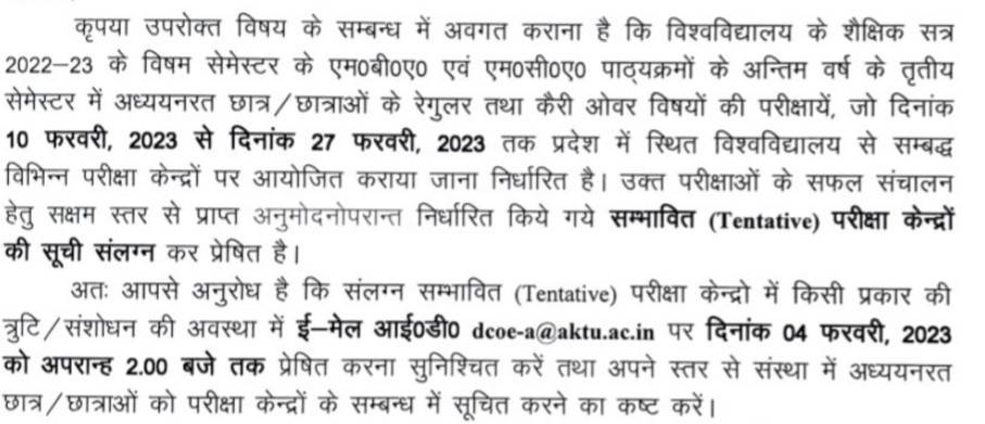 According to the official notification released by AKTU (in Hindi), AKTU has released a list of tentative exam centers where examinations of regular and carryover subjects of MBA and MCA courses of odd semester for University session 2022-23 will be held. In case of any error in the tentative exam center, candidates are requested to email on dcoe-a@aktu.ac.in latest by February 4, 2023, 2 pm. Also, inform your colleagues about the tentative exam centers.