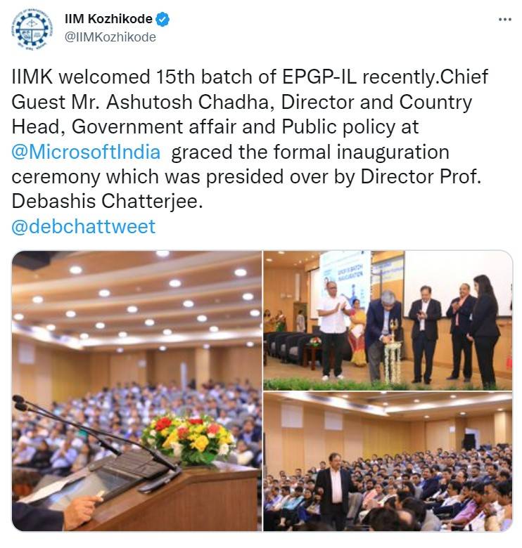 An official tweet by the institute reads, âI IMK welcomed 15th batch of EPGP-IL recently.Chief Guest Mr. Ashutosh Chadha, Director and Country Head, Government affair and Public policy at @MicrosoftIndia graced the formal inauguration ceremony which was presided over by Director Prof. Debashis Chatterjee. @debchattweetâ