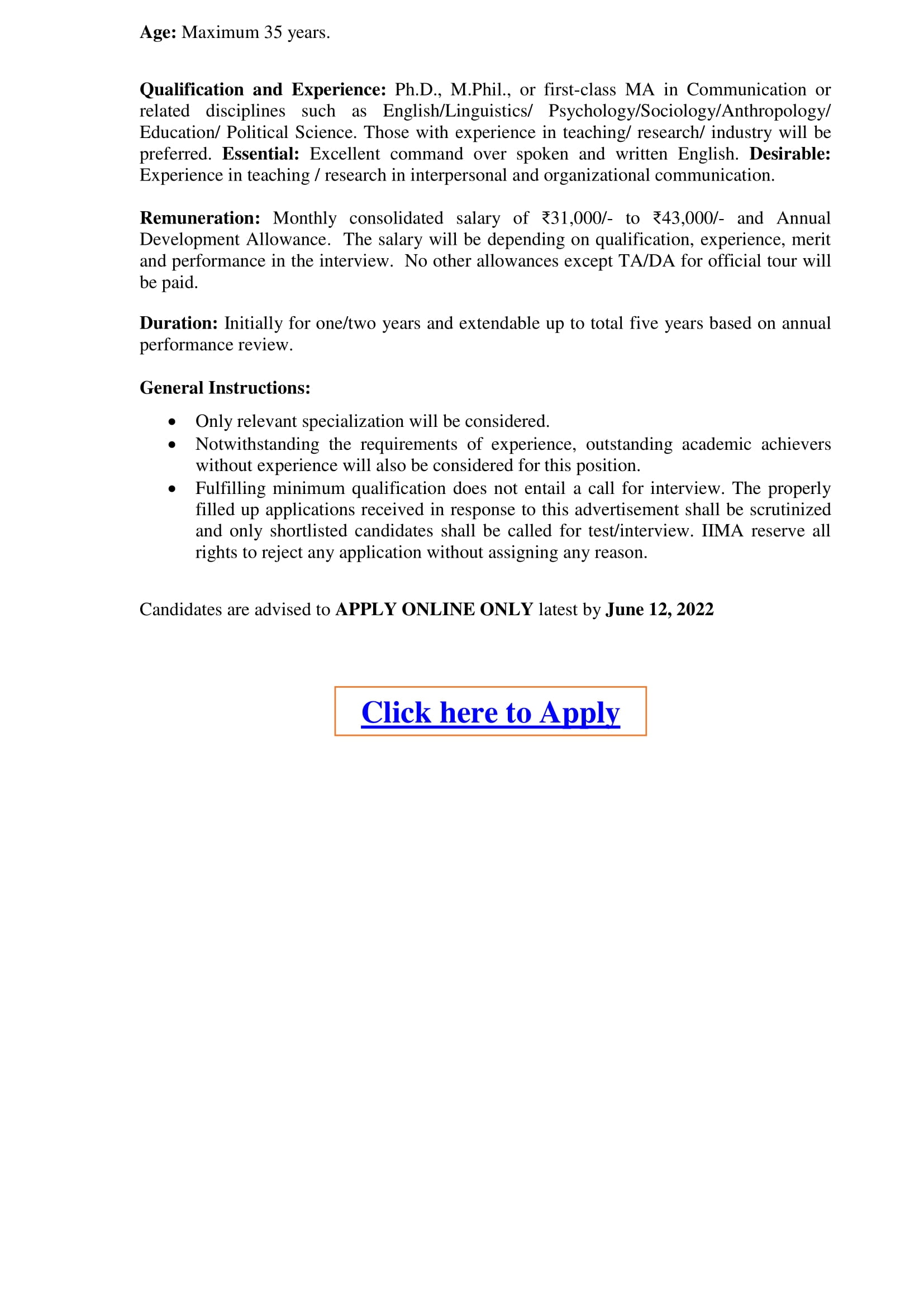 Applications are invited for the post of Academic Associate. Only one vacancy is available for the said post. The last date to apply for the IIM vacancy is June 12, 2022. Candidates must note that the job location would be Ahmedabad. Candidates who are comfortable relocating to the job location may apply for the IIM Ahmedabad job vacancy. The maximum age limit for applying for the post is 35 years.