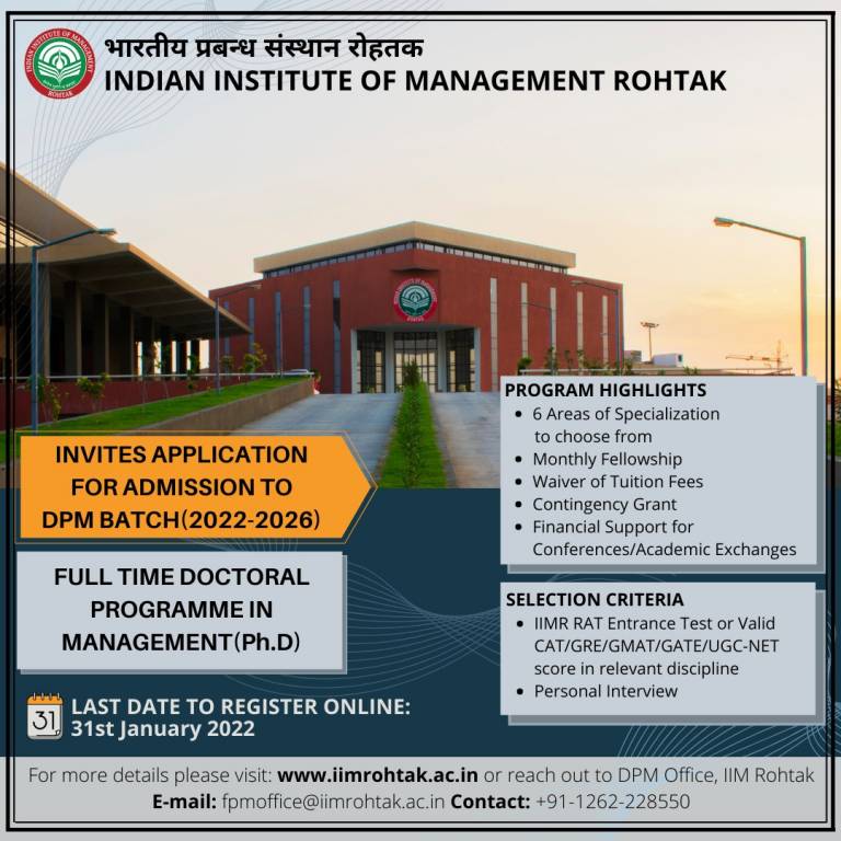 IIM Rohtak Admissions 2022: Indian Institute of Management (IIM) Rohtak has commenced the admission application process for the tenth batch of its full-time doctorate programme in management (DPM). The last date to register for the doctorate programme at IIM Rohtak is January 31, 2022. The admission to DPM of IIM Rohtak is open to all Indian citizens, non-resident Indians, persons of Indian origin living abroad and other foreign citizens.