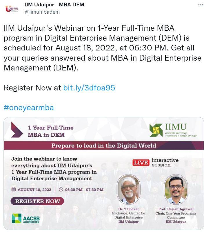 According to the post, the institute is conducting the webinar to resolve queries of candidates regarding the IIM Udaipur 1-Year full-time MBA program in Digital Enterprise Management course, curriculum, admission process, selection criteria, eligibility and more. Dr Y Shekar (In charge Centre of Digital Enterprise, IIM Udaipur) and Professor Rajesh Agrawal (Chair, One Year Programs Committee, IIM Udaipur) will be leading the interactive session.