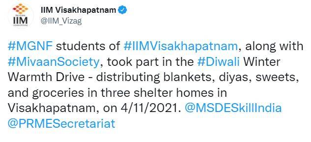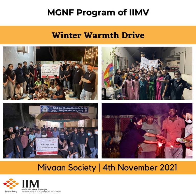 Indian Institute of Management (IIM) Visakhapatnam’s first batch of Mahatma Gandhi National Fellowship program (MGNF) participated in the Mivaan Society’s ‘Winter Warmth Drive’. The drive was conducted at three orphanages - Care and Love (Madhavadhara), Manasu Girls’ Home (Simhachalam) and Hope Blind Home (Vepagunta). Being part of the initiative, the MGNF students distributed earthen lamps, sweets, groceries, and blankets among the children.