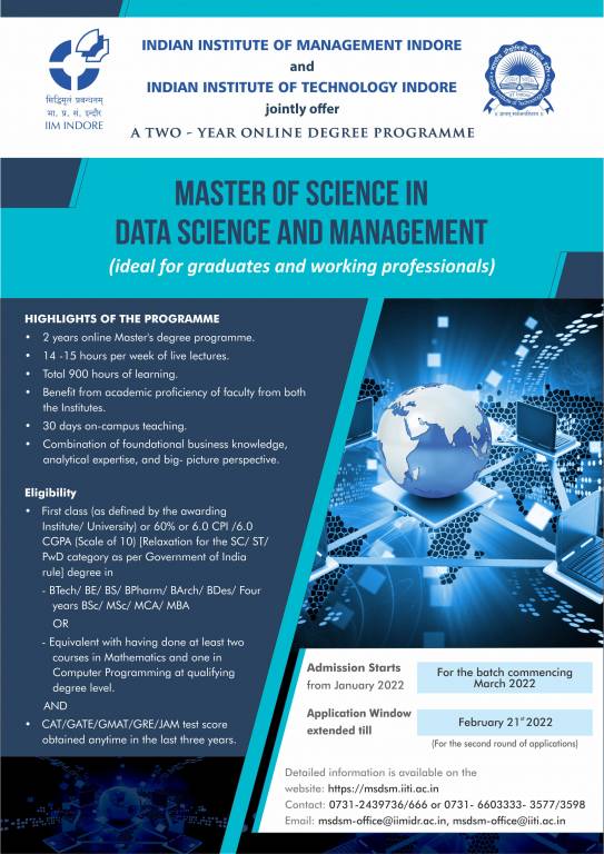 Candidates interested in the Data Science and Management programme offered by both IIM and IIT Indore must note that the institutes have already commenced the admission process for the same. The last date to apply for Masters of Science in Data Science and Management is February 21, 2022. According to the information provided by the institutes, the batch will commence by March 2022. Talking about the seat intake, the institute state, “Up to 200 candidates will be considered for admission to the programme (Reservation in admissions as per Government of India rules).”