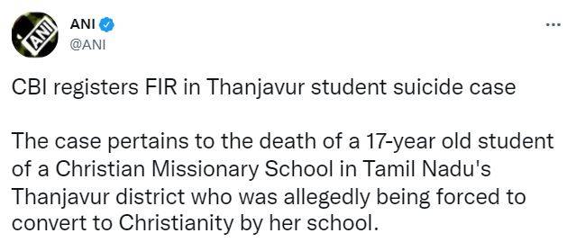 Thanjavur Student Suicide Case: According to the latest update Central Bureau of Investigation (CBI) has decided to take over the Thanjavur student suicide case as the bureau has registered an FIR. According to ANI, “CBI registers FIR in Thanjavur student suicide case. The case pertains to the death of a 17-year old student of a Christian Missionary School in Tamil Nadu's Thanjavur district who was allegedly being forced to convert to Christianity by her school.”