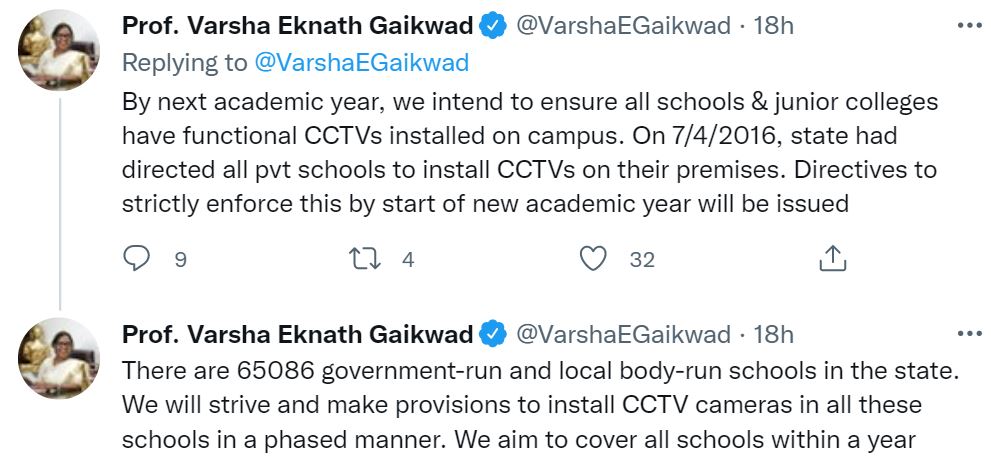 Directly all schools to install CCTV cameras with immediate effect, Gaikwad said, “All these schools must deploy CCTV cameras to put a check on sexual harassment. We will make it mandatory for schools to support the CCTV cameras with a hard drive so that daily footage can be recorded and made available if required for inquiry.”
