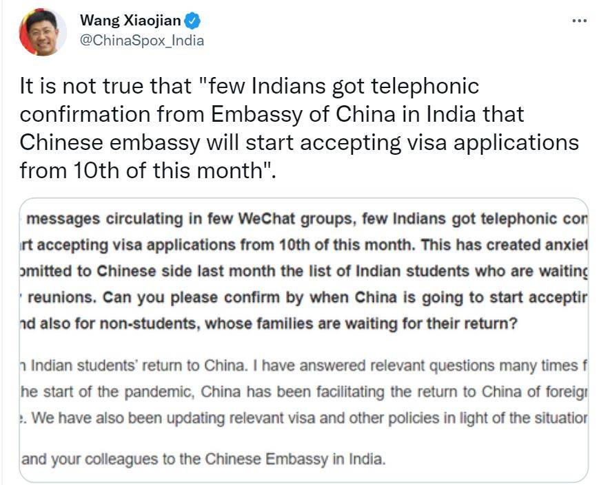 The clarification came after a few Indians reported of getting a telephonic confirmation from the Embassy of China in India about the Chinese embassy receiving visa applications from June 10, 2022.