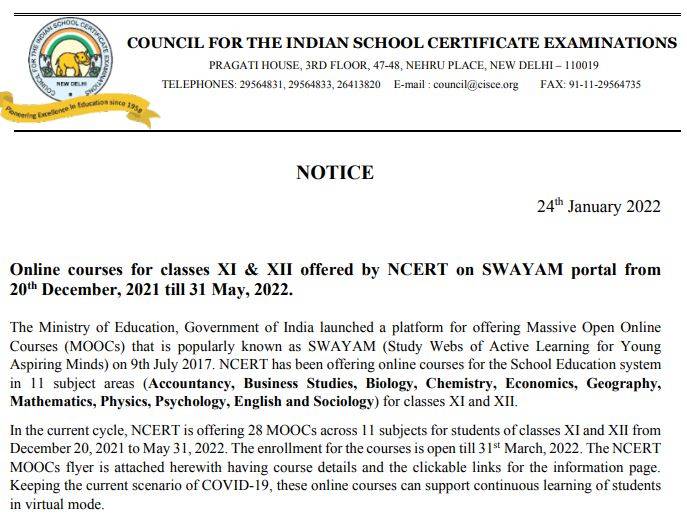 Candidates must note that the online course is being conducted from December 20. The authorities would conclude the conduct of the courses on May 31. CISCE in its official notice said, "In the current cycle, NCERT is offering 28 MOOCs across 11 subjects for students of classes XI and XII from December 20, 2021, to May 31, 2022. The enrollment for the courses is open till March 31.”