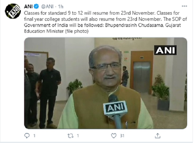 “Classes for standard 9 to 12 will resume from November 23. Classes for final year college students will also resume from November 23. The SOP of Government of India will be followed,” said Bhupendra Singh Chudasama.