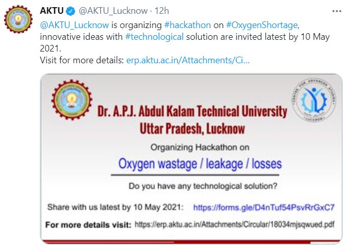 Dr APJ Abdul Kalam Technical University released an official notification stating, “AKTU hackathon aims to explore some technology-based solutions to prevent medical oxygen wastage, leakage or losses in hospitals in India, especially in Uttar Pradesh, so that the available oxygen can be utilized in the best way to support the patients in the hospitals during the fight against the COVID-19 pandemic.”