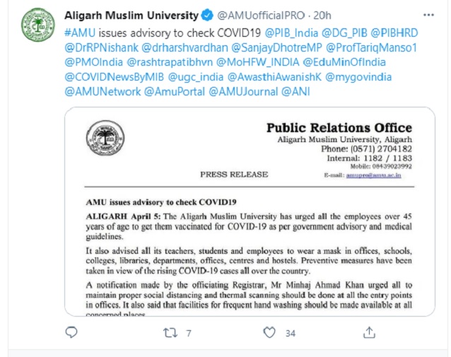The university in the social media handle said: “AMU issues advisory to check COVID-19.”