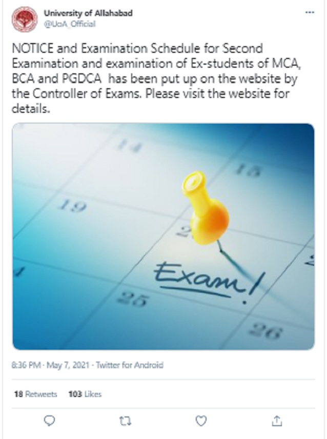 The University of Allahabad announced the exam schedule through its social media handle. It said: “Notice and Examination Schedule for Second Examination and examination of Ex-students of MCA, BCA and PGDCA has been put up on the website by the Controller of Exams.”