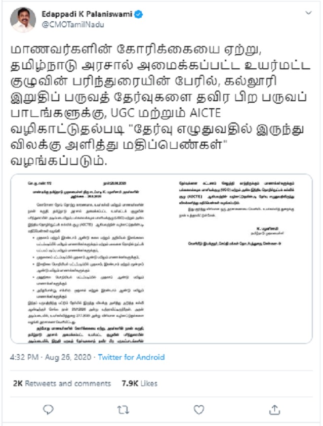 While announcing the decision, Tamil Nadu Chief Minister said that "Except for the final semester exams, students who have paid the fee for subjects related to other semesters and waiting for exams shall be exempted from taking the examinations and they would be awarded marks.” He also added that cancellation of all UG and PG Exams 2020 is in line and compliance with the UGC Guidelines issued on 6th July 2020. AICTE has also issued similar guidelines for students who are in their interim semester.