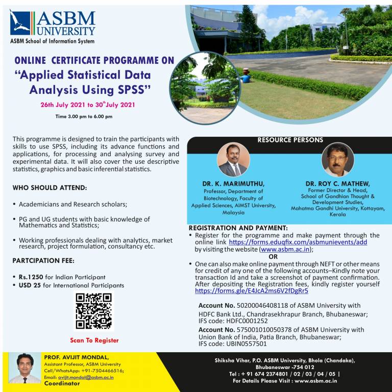 ASBM University online certificate programme on ‘Applied Statistical Data Analysis Using SPSS’ will be offered via virtual mode from July 26 to July 30, 2021 (3 pm to 6 pm).