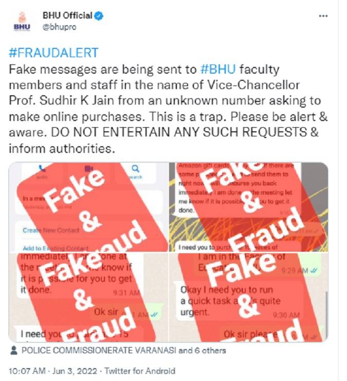 Fake messages are being sent to #BHU faculty members and staff in the name of Vice-Chancellor Prof. Sudhir K Jain from an unknown number asking to make online purchases. This is a trap. Please be alert & aware. DO NOT ENTERTAIN ANY SUCH REQUESTS & inform authorities, BHU tweeted.