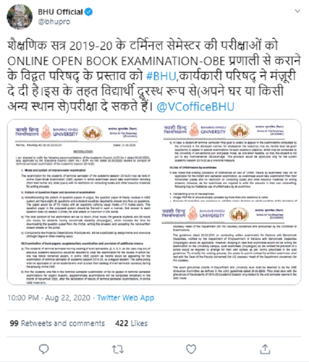 The University on its Twitter handle announced this development and said “Proposal of the Academic Council to conduct the examination of terminal semester of academic session 2019-20 with ONLINE OPEN BOOK EXAMINATION-OBE system #BHU, The Executive Council has approved. Under this, students can take the exam remotely (from their home or any other place).”