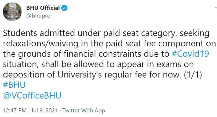 In order to help the students facing financial crisis due to the pandemic, the varsity has decided to offer relaxation to paid seat students. BHU via its official Twitter handle stated that βStudents admitted underpaid seat category, seeking relaxations/waiving in the paid seat fee component on the grounds of financial constraints due to #Covid19 situation, shall be allowed to appear in exams on deposition of University's regular fee for now.β