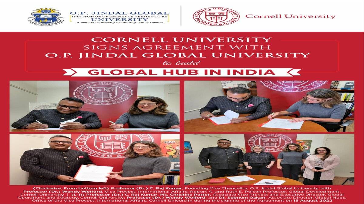 On the signing of the agreement with a leading ivy league university, Professor (Dr.) Mohan Kumar, Dean, Office of International Affairs & Global Initiatives, O.P. Jindal Global University observed that, “We are truly excited at the possibilities of cooperation with Cornell University which will open up following this University wide collaboration with JGU. The concept of Global Hubs is a novel one and JGU will play its full part in realizing the immense potential offered by Cornell University to our students and faculty members in this regard.”