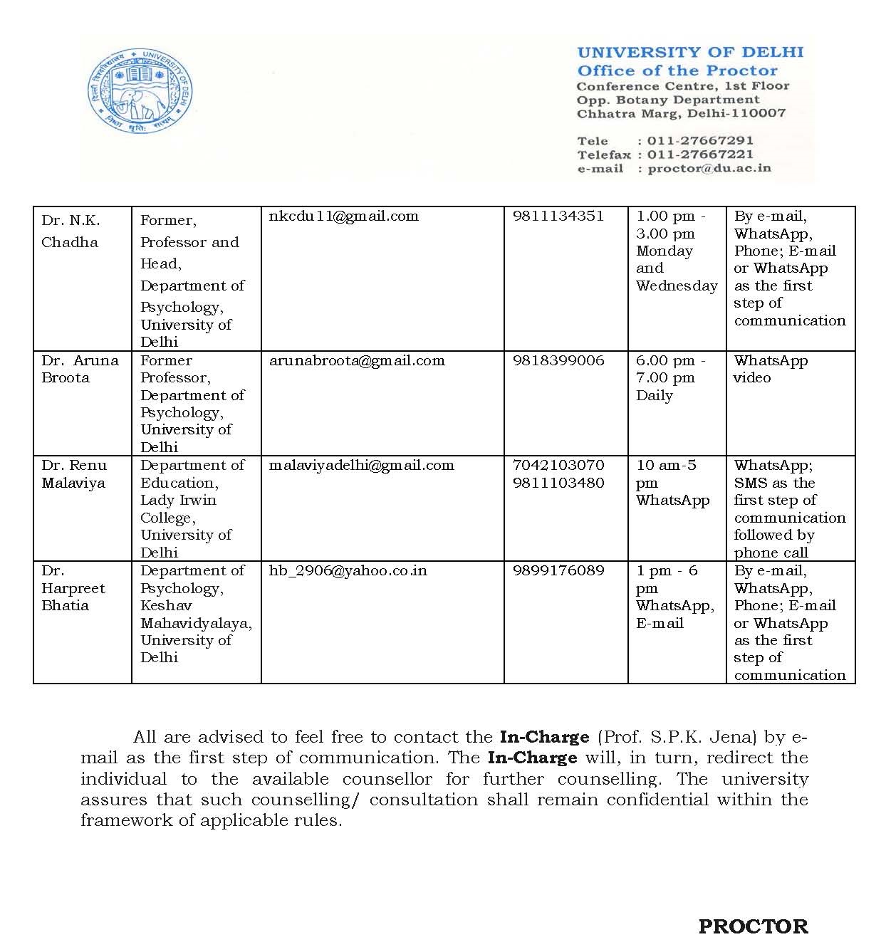 the University of Delhi on April 9, 2020, launched various 24x7 helpline numbers and email addresses for the student, faculty members and non-teaching staff experiencing mental health issues, stress and anxiety due to the nationwide lockdown to contain the spread of COVID-19.