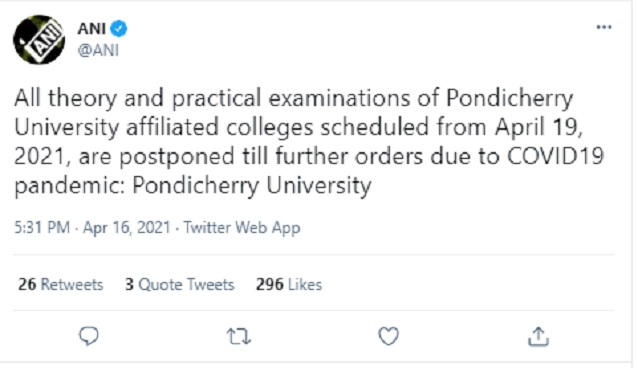 “AII theory and practical examinations of Pondicherry University affiliated colleges scheduled from 19th April 2020 are postponed till further orders due to COVID-19 pandemic. The revised date will be announced later,” the official notification reads.