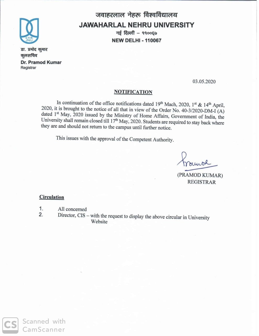 Informing the students about the extension, the University stated, “In continuation of the office notifications dated 19. Mach. 2020, 1st & 14th April 2020, it is brought to the notice of all that in view of the Order No. 40-3/2020-DM-I (A) dated 1st May. 2020 issued by the Ministry of Home Affairs, Government of India, the University shall remain closed till May 17, 2020. Students are required to stay back where they are and should not return to the campus until further notice.”