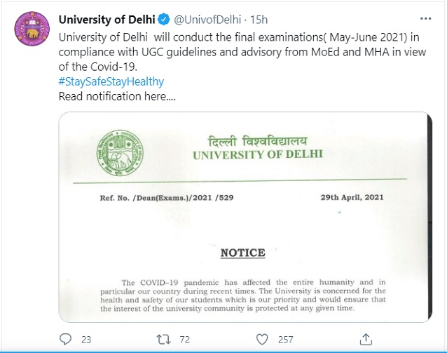 "The university has been receiving requests related to the examination of terminal semester final year students scheduled for May-June 2021. The university would take stock of the situation and would come out with its decision at the earliest for the conduct of the May - June 2021 examination (final year semester) in compliance with UGC guidelines and advisory issued by the Ministry of Education and Ministry of Home Affairs (MHA)," the notification read.