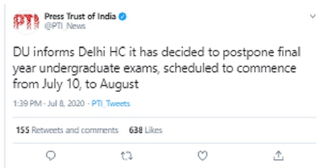 The Delhi University today informed the Delhi High Court that the final year Undergraduate exams which were scheduled to begin from July 10 has been postponed and will now be conducted in August.