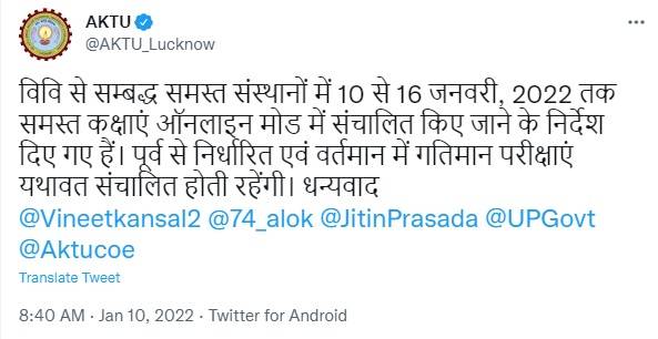 AKTU incumbent Vice-Chancellor Prof Vineet Kansal said instructions had been issued to all affiliated colleges to conduct all classes in online mode from January 10 to 16. “Online classes will continue till January 16 and after that the university will review its decision and fresh guidelines will be issued,” he said.