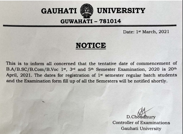 The Gauhati University has released the UG semester exam dates. As per the varsity, the exams for the undergraduate courses will begin on April 20, 2021. The Gauhati University UG semester exam will be held in offline mode. The Gauhati University has declared the examination dates for the 1st, 3rd and 5th semester of BA, B.Com B. Vocational and B.Sc courses.