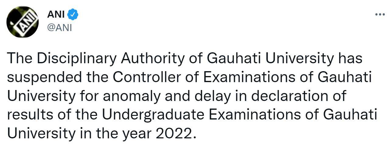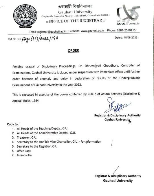 The statement issued by Gauhati University read, "Pending drawal of Disciplinary Proceedings, Dr. Dhruwajyoti Choudhury, Controller of Examinations, Gauhati University is placed under suspension with immediate effect until further order because of anomaly and delay in declaration of results of the Undergraduate Examinations of Gauhati University in the year 2022."