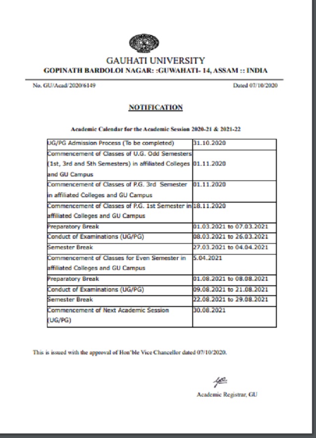Gauhati University will begin its academic session for the UG courses from November 1, 2020.
