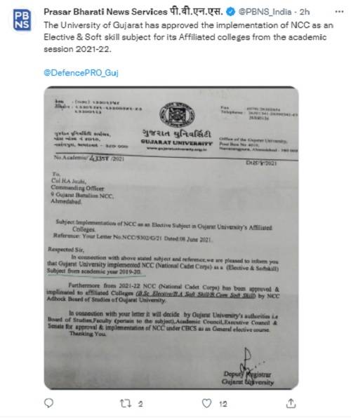 The University of Gujarat has approved the implementation of NCC as an Elective & Soft skill subject for its Affiliated colleges from the academic session 2021-22. "The Gujarat University has implemented NCC (National Cadet Corps) as an (Elective & Softskill) subject from the academic year 2019-20. Furthermore from 2021-22 NCC has been approved and implemented to affiliated colleges (BSc Elective/ BA Soft Skill/ BCom Soft Skill) by NCC Adhock Board of studies of Gujarat University," the notification read.
