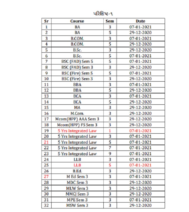The examinations which will commence from January 7, 2021, include BA Semester 3 exams, B.Com semester 3, B.Sc, B.Sc FAD, B.Sc Fire Semester 5, and BBA, BCA semester 3. The five years integrated law semester and LLB semester 5 exams will also begin on January 7, 2020.