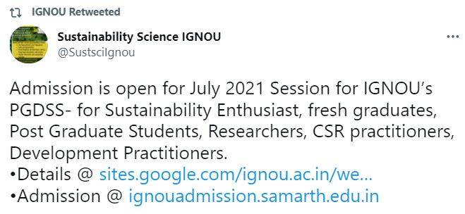 IGNOU Admissions 2021: Indira Gandhi Institute of Open University (IGNOU) invites admission applications for its Post Graduate Diploma in Sustainability Science (PGDSS). Sustainability Enthusiast, fresh graduates, Post Graduate Students, Researchers, CSR practitioners, Development Practitioners interested in IGNOU Admissions 2021 for the said PG diploma programme can apply for the same at the official admission website of IGNOU, i.e. https://ignouadmission.samarth.edu.in/ Applicants must note that the last date to apply for the programme is July 15. The admissions are open for IGNOU July 2021 session. Candidates must note that a non-refundable registration fee of Rs. 200/- (unless specified otherwise) shall be charged along with the programme fee of the first semester/year at the time of admission.
