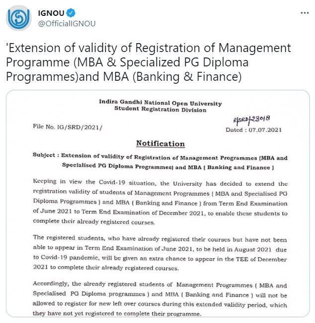 The decision to extend the registration validity has been taken keeping in view the COVID-19 situation. The official notice states that the students, who have already registered for their courses but have not been able to appear in the Term End Examination of June 2021, to be held in August 2021 due to the COVID19 pandemic, will be given an extra chance to appear in the TEE of December 2021 to complete their already registered courses.