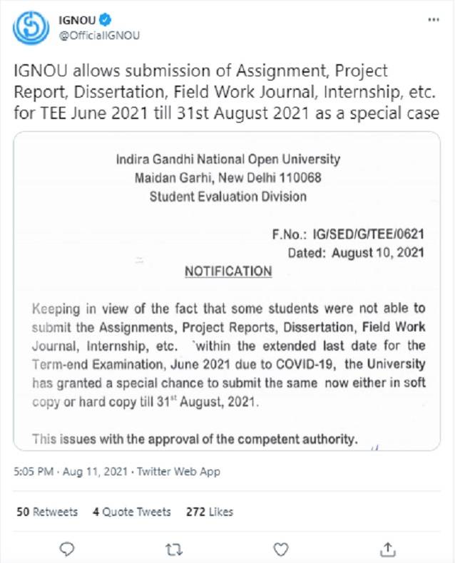 IGNOU on the social media handle stated: “IGNOU allows submission of Assignment, Project Report, Dissertation, Field Work Journal, Internship, etc. for TEE June 2021 till 31st August 2021 as a special case.”