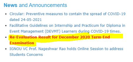 - IGNOU Re-evaluation Result for December TEE 2020 will be displayed