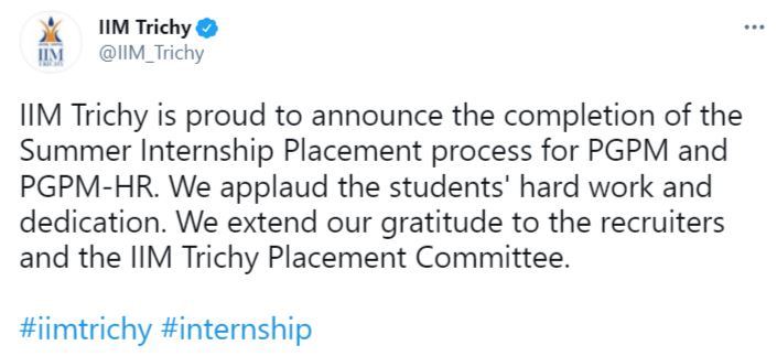IIM Trichy Summer Placement 2021: Indian Institute of Management Tiruchirappalli gladly announces the successful completion of the Summer Placement process for the academic year 2019-20 (PGP 2019-21) of the Post Graduate Program (PGP) in Management. The institute said, “IIM Trichy, fueled by its strong academic culture and faculty body, has provided incredible talent to the business world over the years.”