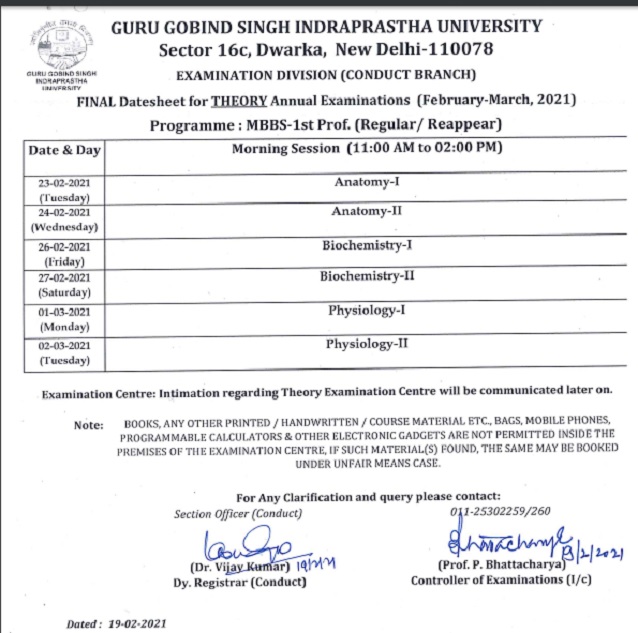 The Guru Gobind Singh Indraprastha University, also known as Indraprastha University (IPU), has released the MBBS First professional programme exam dates. As per the IPU MBBS 1sr professional exam dates, the university will be conducting the theory exams for the regular and reappearing students from tomorrow; i.e. February 23, 2021.Â