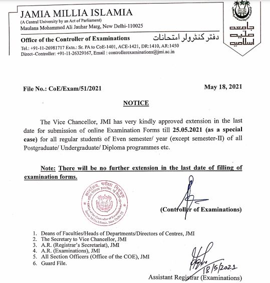 The official notification on Jamia Examination Form 2021 reads, “The Vice-Chancellor, JMI has very kindly approved extension in the last date for submission of online examination forms till May 25, 2021 (as a special case) for all regular students of even semester/ year (except the second semester) of all postgraduate, undergraduate, diploma programmes etc.”