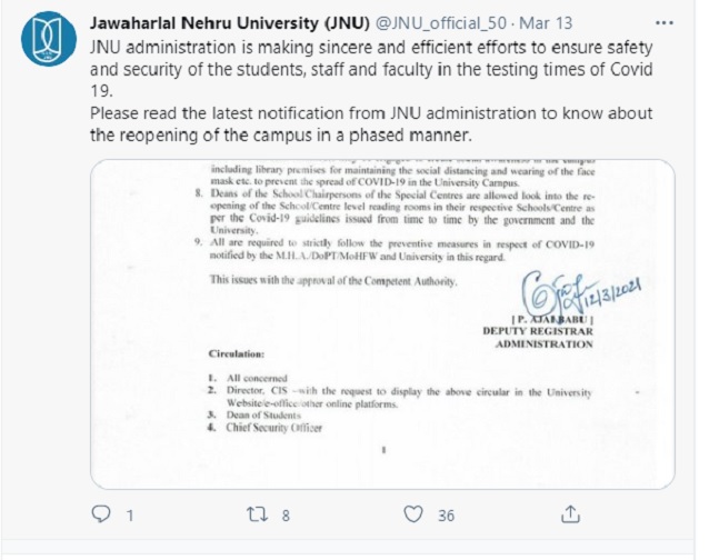 “Please read the latest notification from JNU administration to know about the reopening of the campus in a phased manner,” it added.