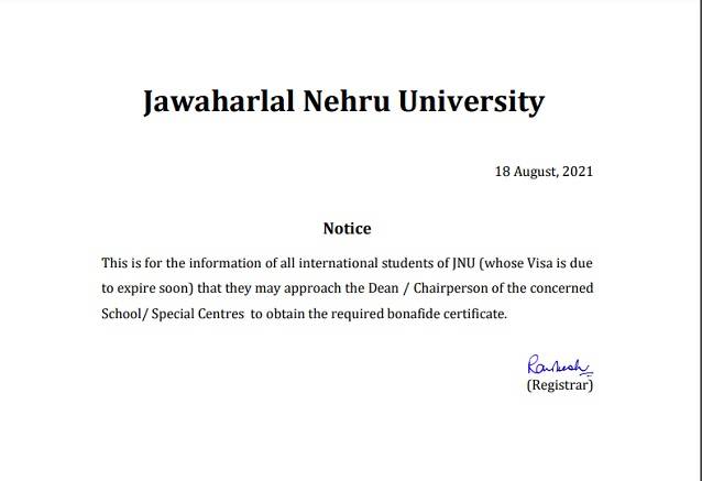 Jawaharlal Nehru University (JNU) has directed all the international students studying at the varsity to approach the Dead/Chairperson of the concerned school/Centre to obtain the required bonafide certificate.