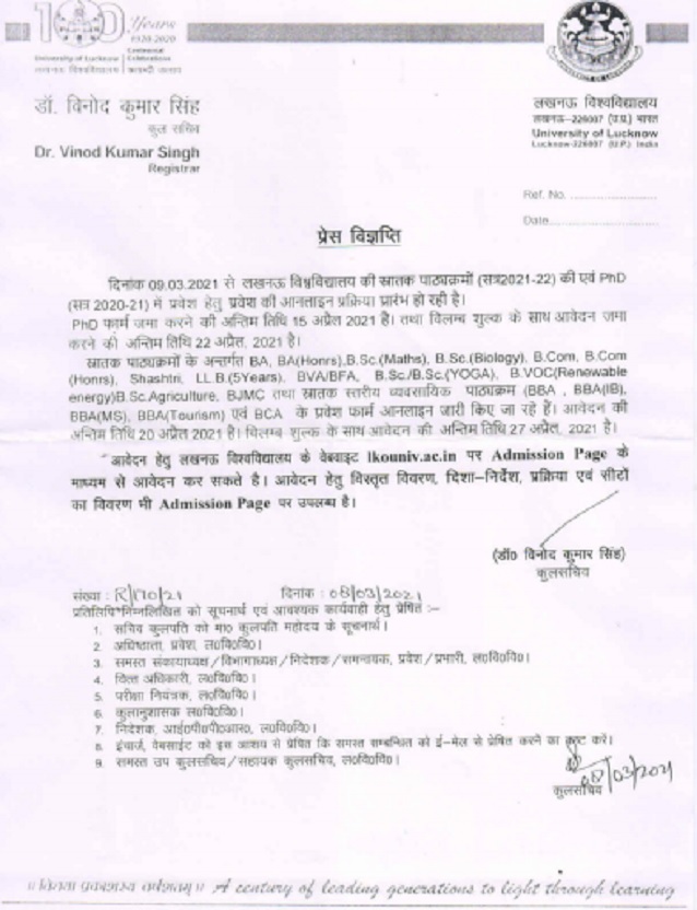 Students who want to take admission to the university can apply online through the official site of the University of Lucknow on lkouniv.ac.in.