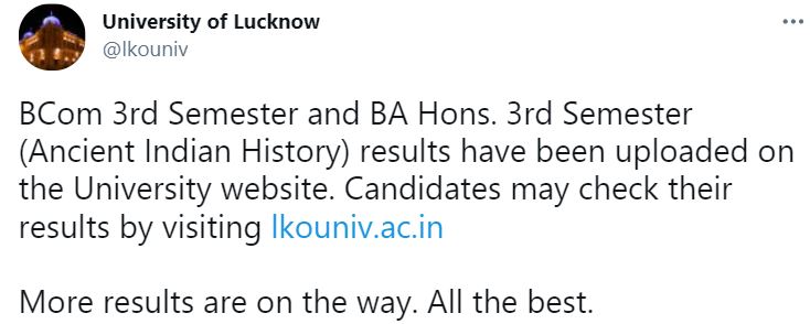 Later, to inform the students about the announcement of the results, the University posted a tweet from its official Twitter handle stating, “BCom 3rd Semester and BA Hons. 3rd Semester (Ancient Indian History) results have been uploaded on the University website. Candidates may check their results by visiting http://lkouniv.ac.in. More results are on the way. All the best.”