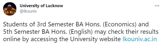 Lucknow University Semester Results 2021: The University of Lucknow now announced the results for the third-semester students of BA honours Economics and fifth-semester students of BA honours English. LU students can check their scorecards at the official website of the University, lkouniv.ac.in. In order to inform the students, the varsity also posted a tweet from its official website. Check the tweet below: